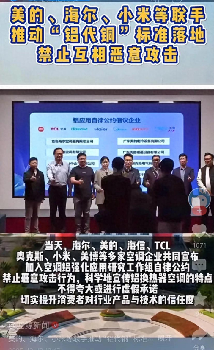 自律公约的签署则为行业生态注入清流。海尔、美的、海信、小米等企业共同约定三条“红线”:禁止恶意攻击同行及产品、科学宣传铝换热器特点、不夸大不做虚假承诺。这一“止战协议”终结了此前“铜优于铝”的片面宣传乱象,让行业竞争回归技术创新与用户体验的核心。企业纷纷推出配套举措:小米在产品说明书中明确标注“铝制换热器”并提供10年质保,中国家用电器研究院推出“铝应用优品认证”,用透明化举措重建消费者信任。